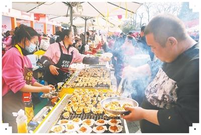 丰都庙会现场,游客品尝美食。